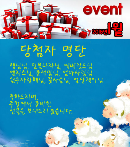 2015년 1월 이벤트 당첨자 명단입니다 페이지 정보 작성자 주주컬처 댓글 0건 조회 4,794회 작성일 15-02-12 21:57 목록 본문 축하드립니다!! 이전글선물을 보내주셨네요. 15.03.06 다음글대판싸움! 15.02.02 댓글 0 댓글목록 등록된 댓글이 없습니다.