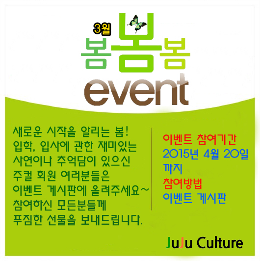 봄과함께 3월 이벤트 시작합니다 페이지 정보 작성자 주주컬처 댓글 0건 조회 4,512회 작성일 15-03-09 22:12 목록 본문 봄과함께 3월 이벤트 시작합니다 이전글인생에 입학식은 무수히 많다. 15.03.10 다음글선물을 보내주셨네요. 15.03.06 댓글 0 댓글목록 등록된 댓글이 없습니다.