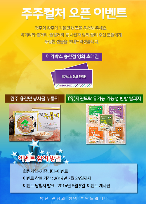 주주컬처 오픈 이벤트 페이지 정보 작성자 주주컬처 댓글 0건 조회 4,580회 작성일 14-07-02 18:31 목록 본문 주주컬처 회원님들! 이벤트에 많이 참여 하세요~ 이전글7월 이벤트 당첨자 명단입니다 14.08.14 댓글 0 댓글목록 등록된 댓글이 없습니다.