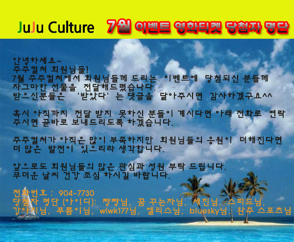 7월 이벤트 당첨자 명단입니다 페이지 정보 작성자 주주컬처 댓글 0건 조회 4,589회 작성일 14-08-14 09:04 목록 본문 7월 이벤트 당첨자 명단입니다~!! 축하드립니다!!! 이전글주주컬처~9월 이벤트!! 선물 펑펑 쏩니다 14.09.14 다음글주주컬처 오픈 이벤트 14.07.02 댓글 0 댓글목록 등록된 댓글이 없습니다.
