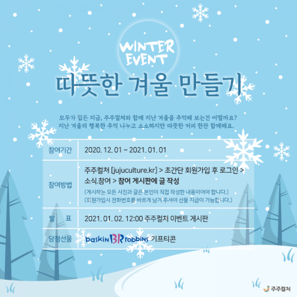 겨울이벤트 [ 겨울의 추억을 나누어요~!!] 페이지 정보 작성자 주주컬처 댓글 0건 조회 1,428회 작성일 20-12-02 21:06 목록 본문 추억 나누러 가기 http://jujuculture.kr/gnbd/bbs/board.php?bo_table=travel 이전글여름이벤트 :: 슬기로운 휴가생활!! 21.06.15 다음글가을의 추억 공유 이벤트~!! 20.10.19 댓글 0 댓글목록 등록된 댓글이 없습니다.