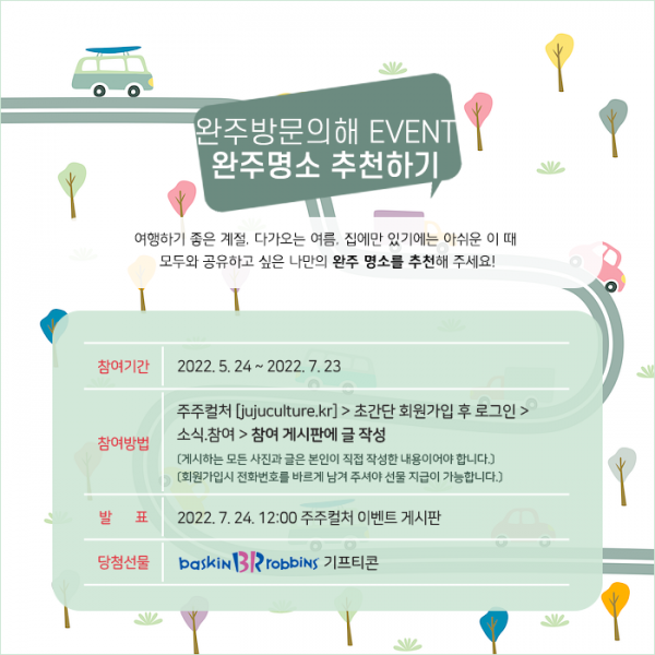 완주방문의해 맞이 완주 명소 추천 이벤트!! 페이지 정보 작성자 주주컬처 댓글 0건 조회 1,941회 작성일 22-05-24 11:37 목록 본문 이벤트 참여 게시판 바로가기 관련링크 http://www.jujuculture.kr/gnbd/bbs/board.php?bo_table=travel 630회 연결 다음글2022 새해맞이 특별 이벤트~!!! 21.12.16 댓글 0 댓글목록 등록된 댓글이 없습니다.