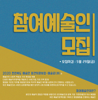 ‘전라북도 예술인파견사업-예술로(路)’ 참여 예술인 모집 페이지 정보 작성자 주주컬처 댓글 0건 조회 2,426회 작성일 20-05-16 13:05 목록 본문 ‘전라북도 예술인파견사업-예술로(路)’ 참여 예술인 모집 이전글제21회 전주국제영화제 2차 공식포스터 공개 20.05.16 다음글비대면콘텐츠제작지원사업, 송지호“행복토끼” 20.05.15 댓글 0 댓글목록 등록된 댓글이 없습니다.