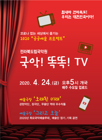 ‘유튜브’ 등 포털사 이트에서 ‘전북도립국악원 TV’ 또는 ‘국악 똑똑 TV’를 검색하면 된다.