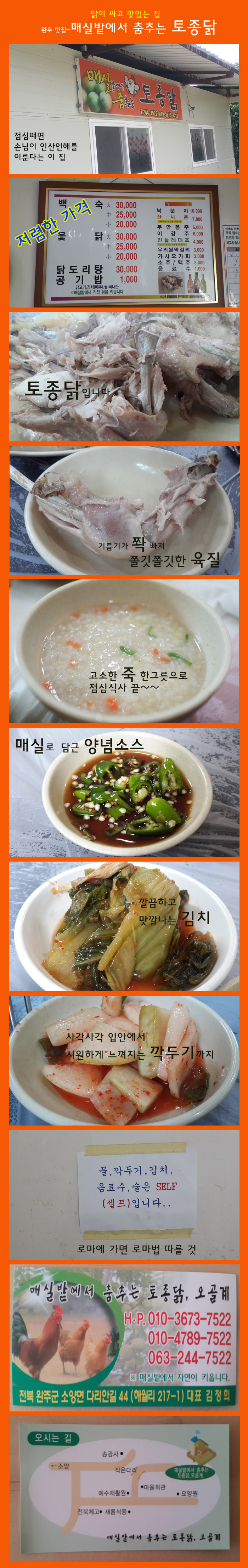 백숙이 싸고 맛있는 집-매실밭에서 춤추는 토종닭 [이 게시물은 최고관리자님에 의해 2017-06-15 11:14:32 가볼만한곳에서 이동 됨] [이 게시물은 최고관리자님에 의해 2017-06-15 11:15:59 식도락여행에서 이동 됨] [이 게시물은 최고관리자님에 의해 2017-06-15 11:19:19 가볼만한곳에서 이동 됨]