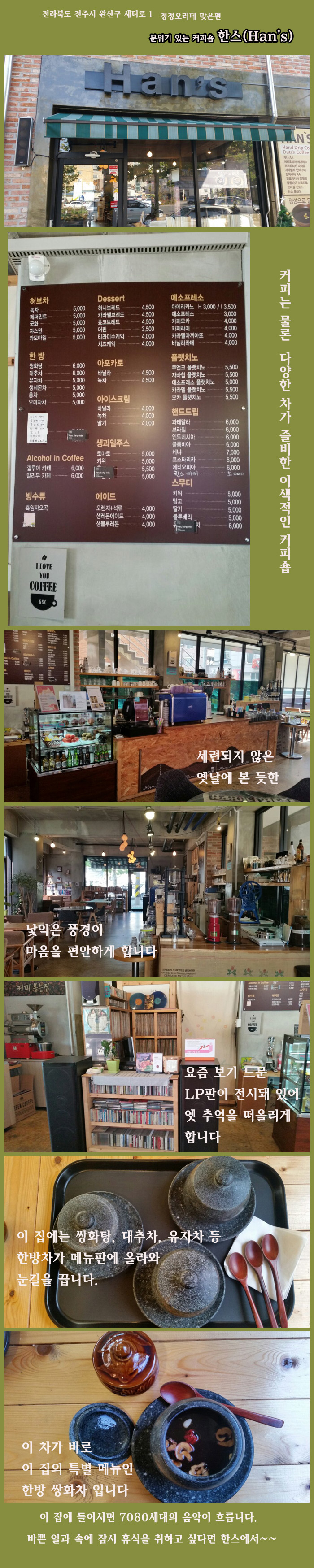 전라북도 전주시 완산구 새터로 1 청정오리떼 맞은편 한스 커피숍 [이 게시물은 최고관리자님에 의해 2017-06-15 11:14:32 가볼만한곳에서 이동 됨] [이 게시물은 최고관리자님에 의해 2017-06-15 11:15:59 식도락여행에서 이동 됨] [이 게시물은 최고관리자님에 의해 2017-06-15 11:19:19 가볼만한곳에서 이동 됨]