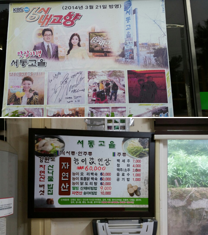 이집에는 능이 버섯을 이용한 요리들이 주를 이루는데 능이버섯 오리탕 , 능이버섯 백숙, 능이버섯 닭 내장탕등이 메뉴판을 장식한다. 뿐만 아니라 자연산 버섯 비빕밥과 , 산나물 비빕밥 또한 한끼식사로 손색이 없을만큼 독특한 맛을 느낄수 있었다. 밑반찬 역시 그곳에서 기른 자연식야채임을 바로 알수 있었다. 조각공원도 구경하고 맛난 음식도 먹고 일석 이조가 아닐듯...