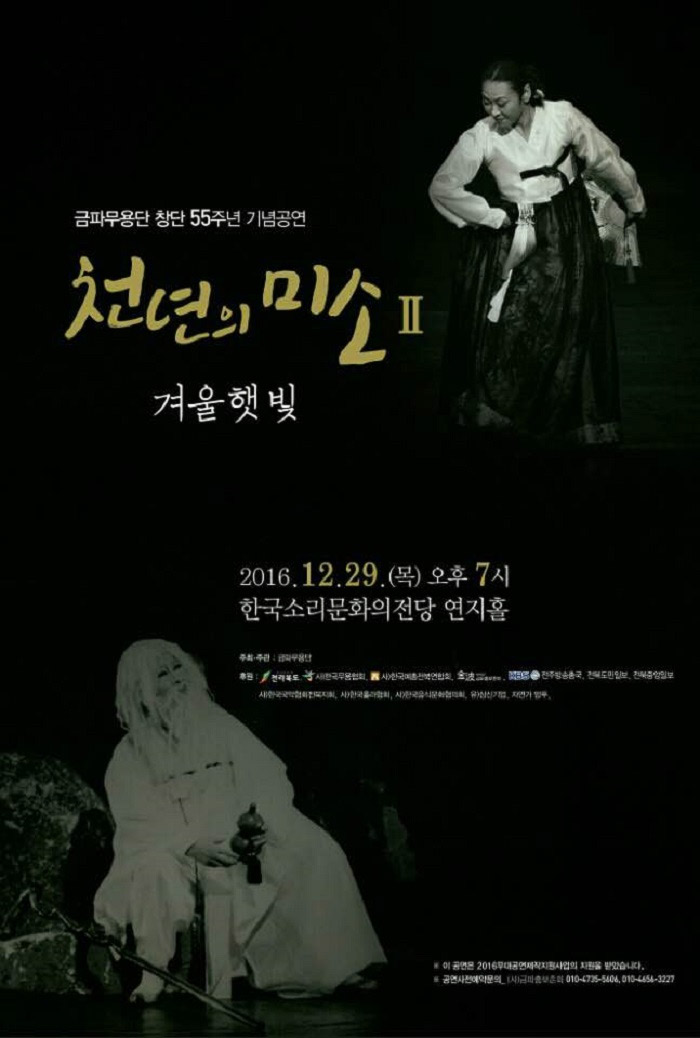 “겨울햇빛”은 1980년 제2회 대한민국 무용제 참가작으로 故 금파선생님의 안무작 중 하나이다. 벙어리 머슴 들쇠의 주인집 딸 옥이에 대한 연정, 신분의 차이로 한 평생 연정을 표현하지 못한 돌쇠의 애환, 결국 불길에 뛰어들어 옥이를 구하고 자기를 희생하는 숭고한 사랑에 대한 이야기이다. 故 금파선생님께서는 신분의 고귀함과 비천함을 넘은 순결한 사랑을 이야기 하고자 했고, 애정이 각박한 현실과 이기적인 사랑의 존재 속에서 희생적인 사랑을 모럴리스트moralist적 감성으로 갈망했다. 이번 “천년의 미소Ⅱ”에서 재 안무 되어 발표되는 “겨울햇빛 – 소리 없이 빛나는 희망의 빛” 에서는 겨울은 외로움·고뇌·애환 즉 돌쇠의 마음으로 해석 되어 지며, 햇빛은 희망·꿈·사랑 즉 옥이로 해석할 수 있다. 따라서 겨울햇빛은 인간이 가지고 태어난 본성의 외로움과 늘 채워지지 않는 사랑에 대한 애환이 담긴 희망의 빛이다. “겨울햇빛 – 소리 없이 빛나는 희망의 빛” 의 모럴리스트moralist적 상상은 세상에 홀로 있는 것 같은 깊은 고독 속에서 온전한 자신의 모습을 바라보는 한 여인으로부터 시작된다. 겨울, 소망, 연인, 황무지, 바다, 그리고 햇빛… 사랑이 전제 되어지는 인간의 삶 속에서 인간이 살아가야 하는 법, 인간성에 대한 성찰, 어둠 속에서 희망의 빛을 찾아내는 과정을 그려 내고자 한다.