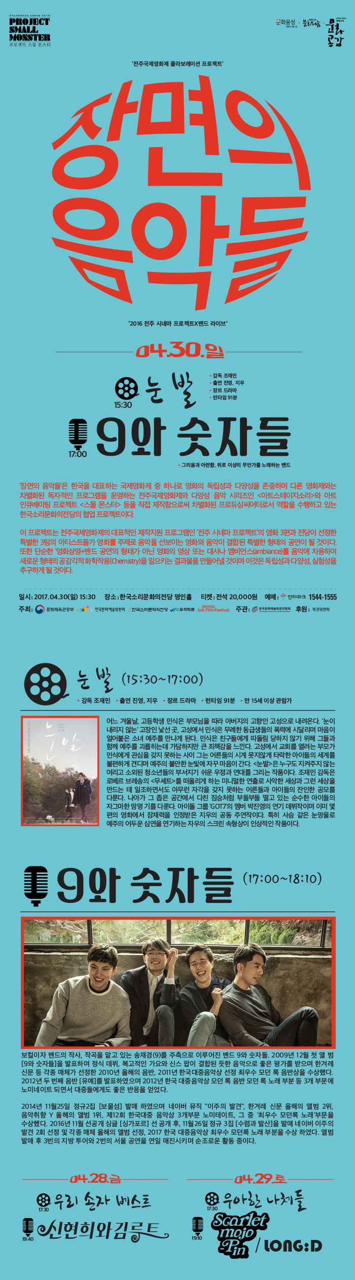 (영화) 15:30 눈발(91’)+(공연) 17:00 9와 숫자들(70') |