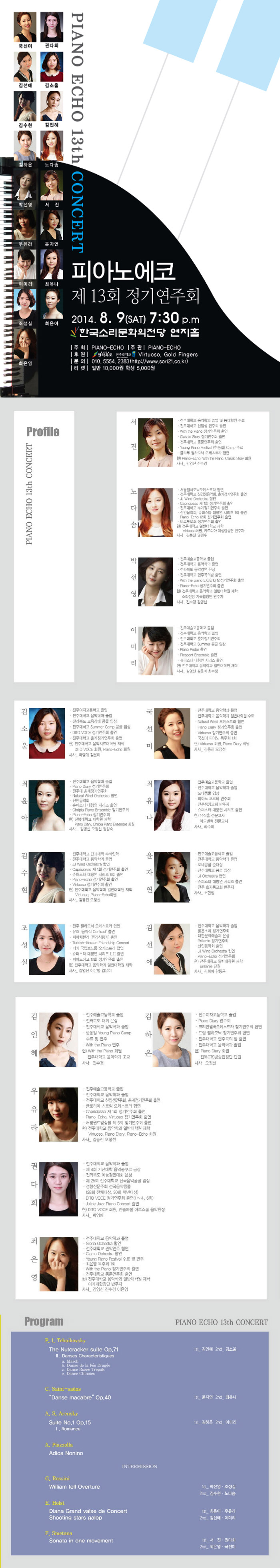 제13회째 정기연주회를 갖는 피아노 에코는 매년 연주회를 계획하고 여러 작곡가들의 곡을 심층 연구하여 연주 활동을 하는 단체로 이번 연주는 기존 오케스트라 곡이나 피아노 솔로 곡 등을 편곡하여 피아노 두 대로 표현하는 무대이다.