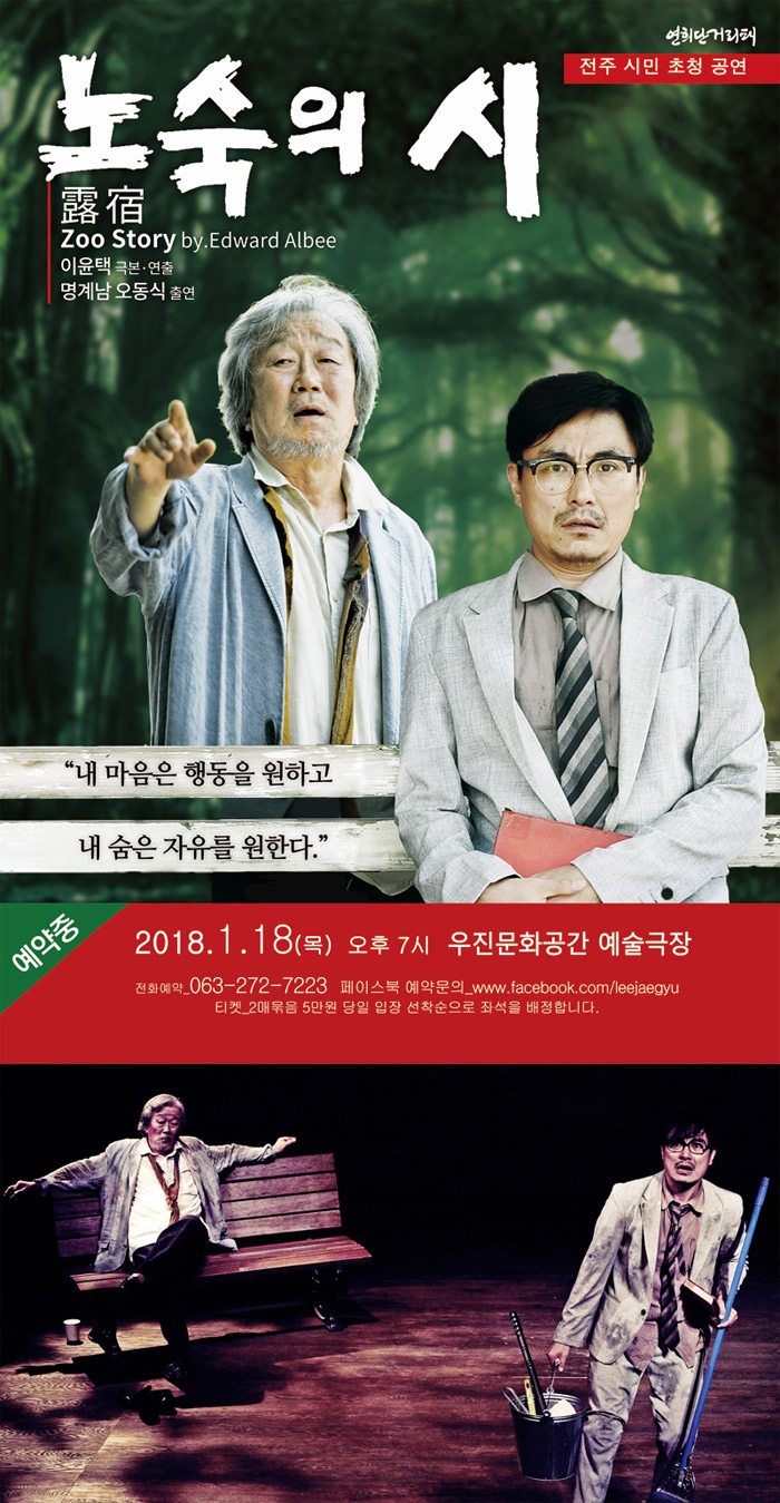 에드워드 올비의 <동물원이야기(zoo story)>는 그동안 국내에서 1970년대부터 꾸준히 소개되어 왔던 올비의 대표작이다. 제리와 피터라는 두 남자가 한 벤치에서 벌어지는이 이야기는 현대를 살아가는 인간의 고뇌와 고독 그리고 인간에 대한 애정을 고스란히표현했다는 평을 받았다. 이러한 영미 현대 희곡의 대표작으로 불리우는에드워드 올비의<동물원 이야기(zoo story)>를 이윤택 연출이 다시 쓰고 연출한 <노숙의 시>라는 작품으로 새롭게 선보인다.