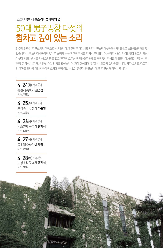 전주의 진짜 봄은 판소리의 향연으로 시작됩니다. 우진의 무대에서 펼쳐지는 판소리다섯바탕의 멋, 올해로 스물여덟번째를 맞았습니다. ‘판소리다섯바탕의 멋’은 소리의 본향 전주의 위상을 지켜낸 무대입니다. 해마다 4월이면 어김없이 최고의 명창 다섯이 5일간 혼신을 다해 소리판을 열고 전주의 소문난 귀명창들은 하루도 빠짐없이 객석을 채워줍니다. 올해는 전인삼, 박춘맹, 왕기석, 송재영, 윤진철 다섯 명창을 모셨습니다. 가장 왕성하게 활동하는 최고의 소리꾼들입니다. 각자 소리도 다르지만 유파도 달라서 다양한 바디의 소리에 흠뻑 취할 수 있는 공연이 되었습니다. 많은 관심과 격려 바랍니다.