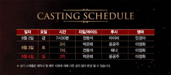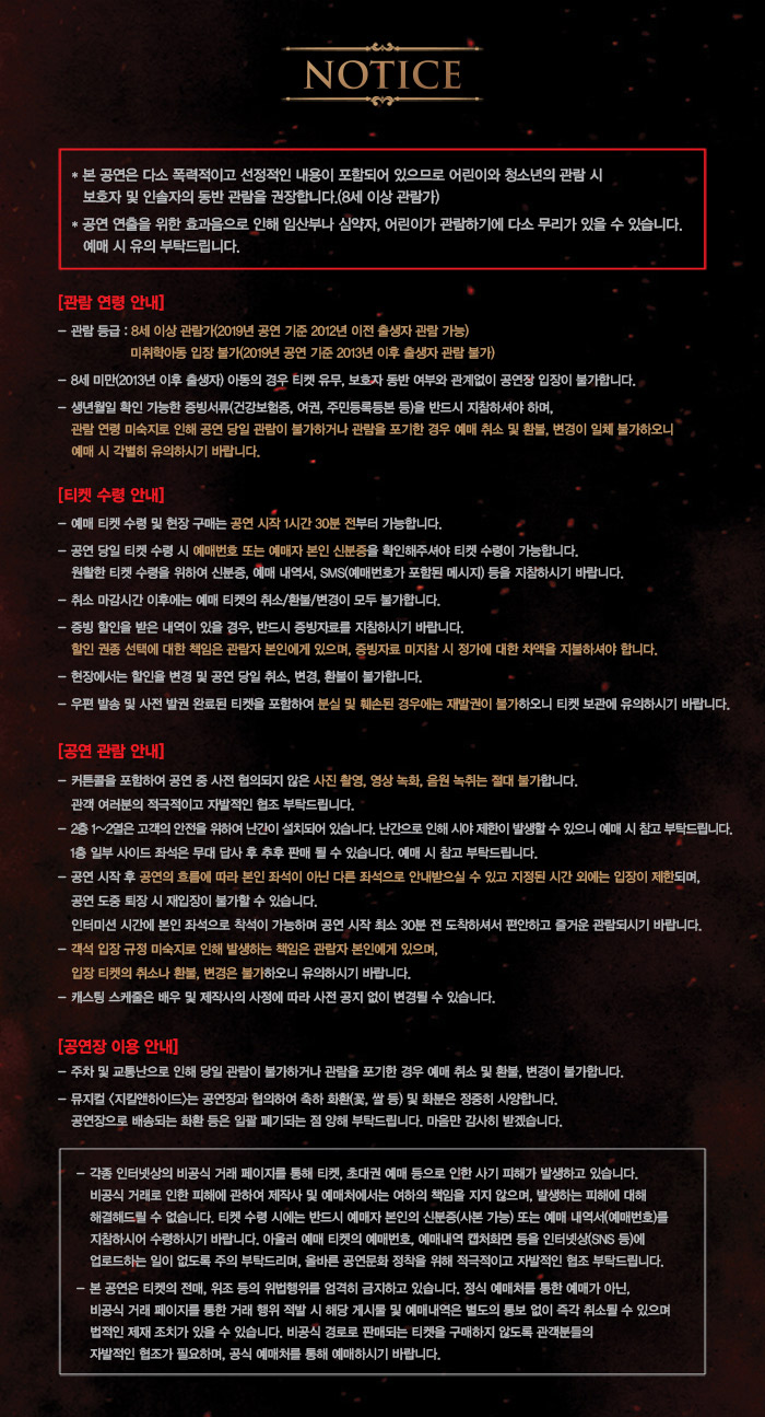 (금) 19:30 (토) 14:00, 19:00 (일) 14:00 / 170분 |