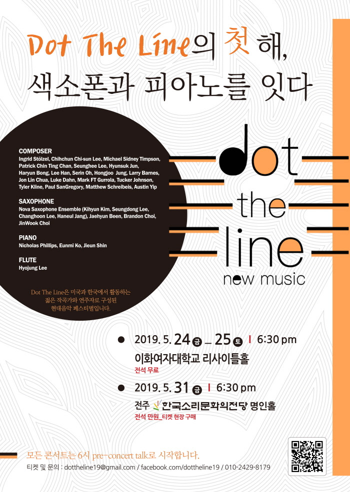 5월 31일 전주 한국소리문화의전당 명인홀에서 열리는 “색소폰과 피아노를 잇다” 콘서트는 색소폰과 피아노곡을 주제로 한 국내외 작곡가들의 다양한 곡들을 선보입니다. 초청 작곡가는 Ingrid Stölzel, Michael Sidney Timpson, 전현석, 이승희입니다. 연주자는 노바 색소폰 앙상블의 이승동, 이창훈, 피아니스트 Nicholas Phillips, 고은미, 신지은입니다. 콘서트 전, 오후 6시에 프리 콘서트 토크가 있습니다. 공연 정보: http://www.eunmiko.com/dot-the-line/