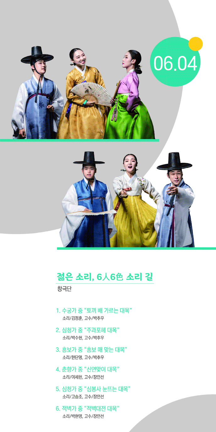 5월28일(오전9시) ~ 6월3일(정오12시)까지 예약하신 분에 한하여 관람이 가능합니다. *코로나19 확산 방지를 위해 객석을 인터넷 예약으로만 운영합니다. *마스크를 꼬~옥!! 착용 바랍니다. (미착용 시 입장이 불가합니다.) 6번째 프로그램 적벽가 중 "적벽대전 대목"이 적벽가 중 "자룡 활 쏘는 대목"으로 변경되었습니다.