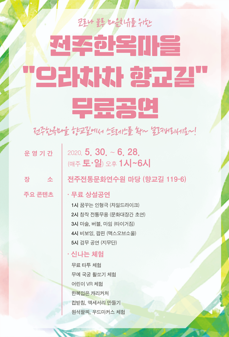 코로나 블루 마음치유를 위한 무료 상설공연과 신나는 체험이 진행됩니다!! 마술,버블,마임,비보잉,검무공연 등 무료공연과 활쏘기,VR,캐리커쳐 등, 전주한옥마을 향교길에서 스트레스를 확 날려버리세요~