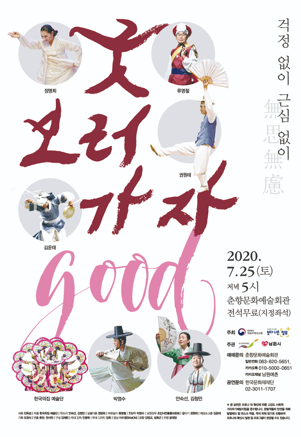지역예술인과 함께하는 2020년 굿GOOD보러가자 무사무려(無思無慮) ‘아무 근심과 걱정도 없다’ 는 뜻으로 코로나19 확산으로 전례 없는 어려움에 빠져있는 상황에서 우리의 평범한 일상의 회복을 바라는 마음을 담음 ※ 찾아가는 굿보러가자 공연이벤트 : 7. 24. (금) 14:00 ~ 16:40 서도역