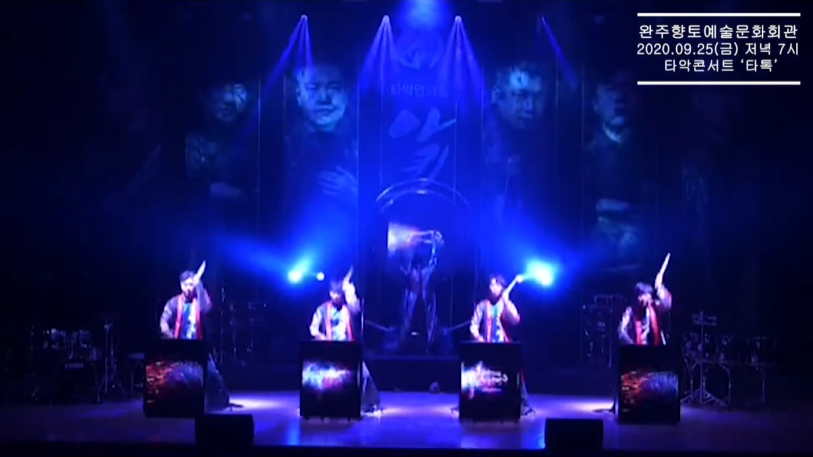 타악콘서트 '타톡' 신나고 즐거운 타악콘서트 '타톡' 다함께 소통하며 명쾌한 공연을 실시간스트리밍으로 만나보아요~ 완주향토예술문화회관 유튜브 https://www.youtube.com/channel/UCOH5i2AJW4NJDcMI9U0YOJQ 밴드 https://band.us/band/67899834 페이스북 https://www.facebook.com/culture7245