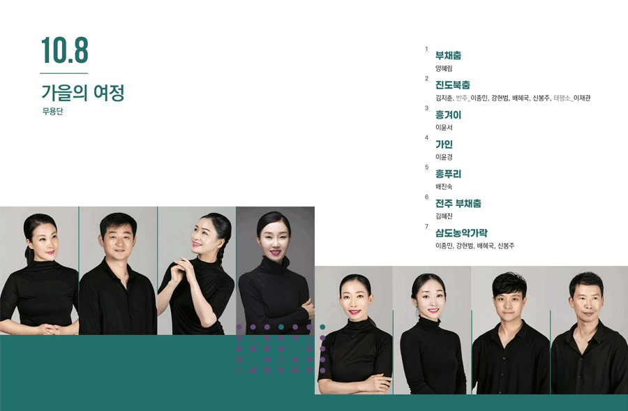 • 부채춤, 진도북춤, 흥푸리 등 일곱 개의 작품으로 한국무용의 멋과 흥을 선사하는 무대