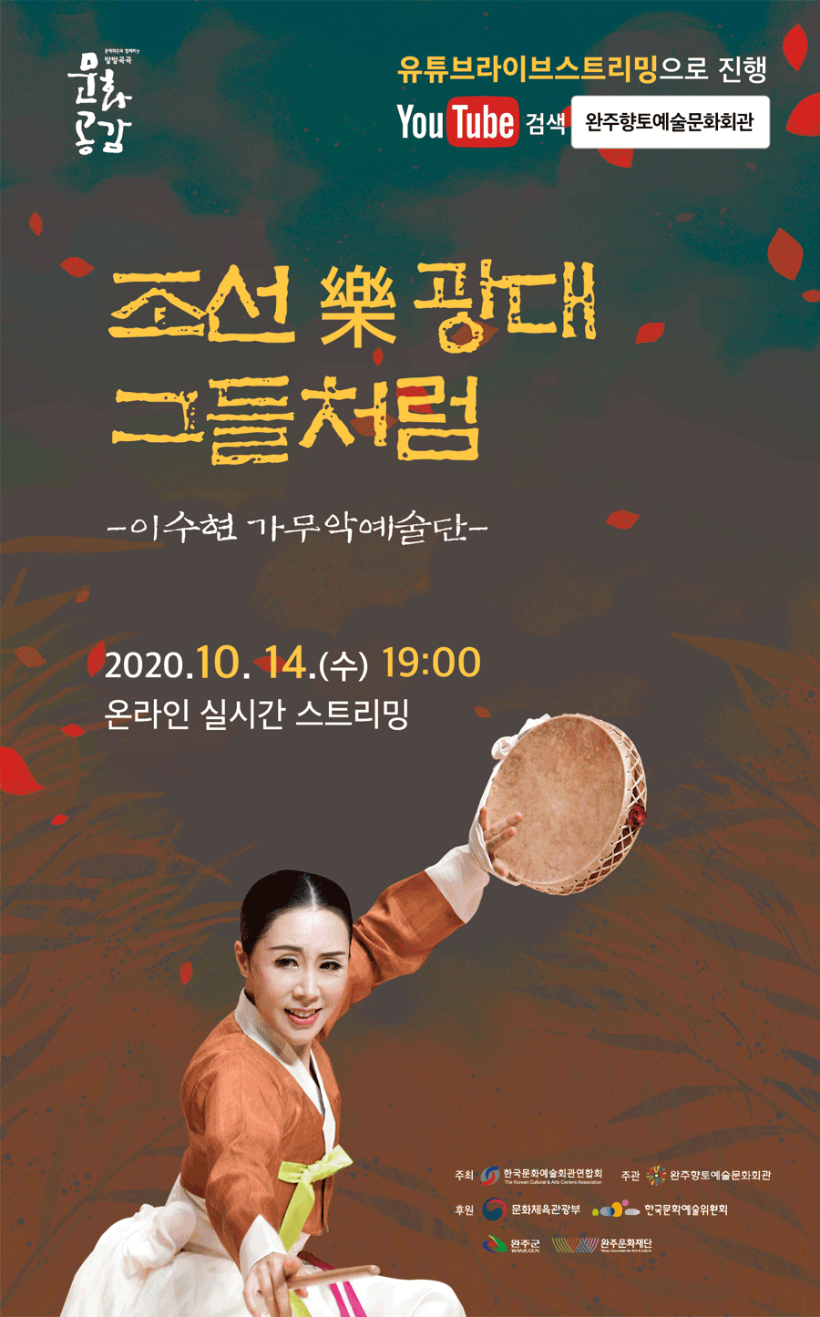 방방곡곡 문화공감사업 우수공연프로그램 ‘조선樂광대 그들처럼’은 10월 14일(금) 저녁 7시에 완주향토예술문화회관 유튜브 채널에서