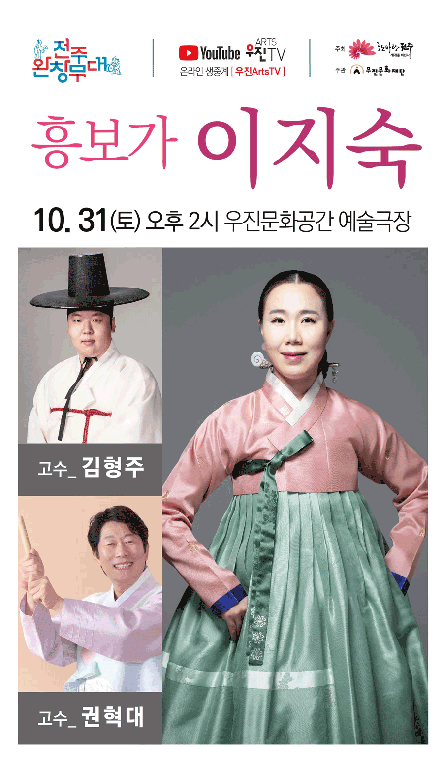 오늘 공연하는 동초제 흥보가는 김연수 명창에서 시작하여 오정숙 명창, 이일주 명창을 거쳐 이지숙 명창이 4시간에 걸쳐 공연을
