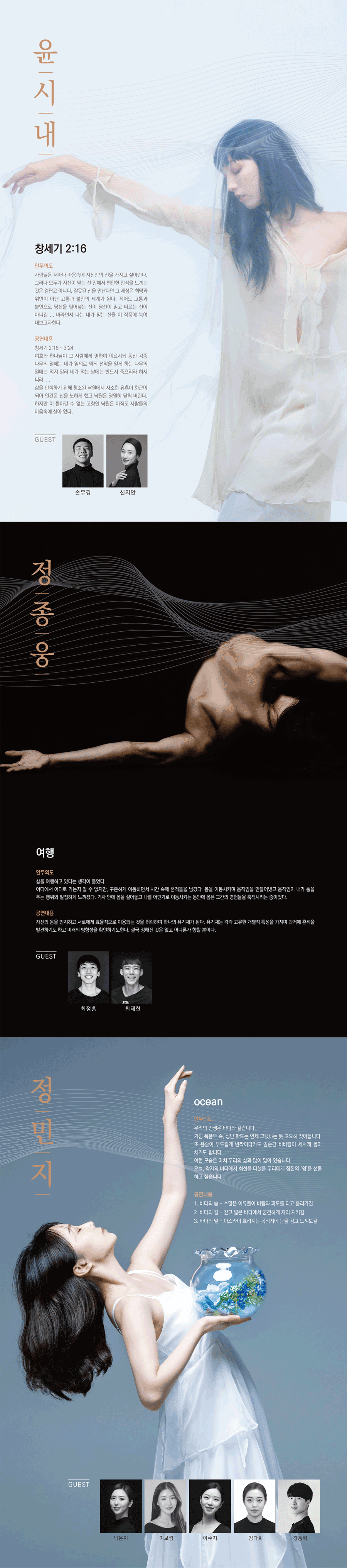 안무의도 : 사람들은 저마다 마음속에 자신만의 신을 가지고 살아간다. 그러나 모두가 자신이 믿는 신 안에서 편안한 안식을 느끼는 것은 결단코 아니다.