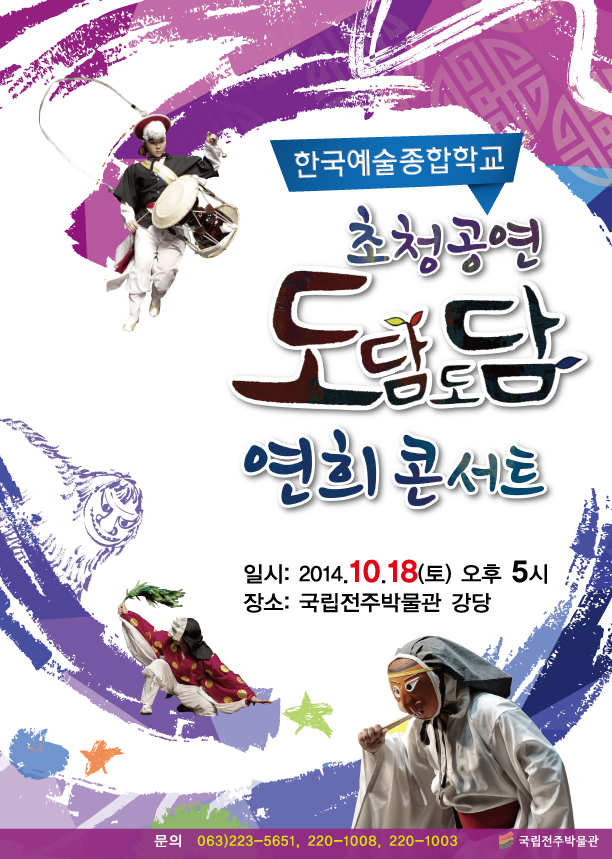 국립전주박물관(관장 유병하)은 국민들에게 다양한 문화향수 기회를 제공하고자 3월부터 10월까지 매주 토요일 관람시간을 오후 9시까지 연장하여 개관하고 있다. 그 일환으로 오는 10월 18일 토요일(17시)에는 국립전주박물관 강당에서 한국예술종합학교 초청 놀이꾼들의 놀이마당 “도담도담” 연희 콘서트 공연이 열린다.