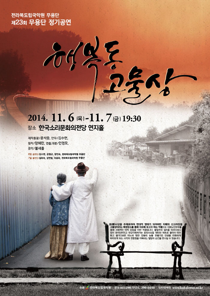 오늘 행복동 고물상에서는 끊임없는 웃음소리가 전북 도민 여러분을 깊은 감동으로 안내할 것입니다. 우리춤으로 풀어내는 효의 이야기 행복동으로 오세요.