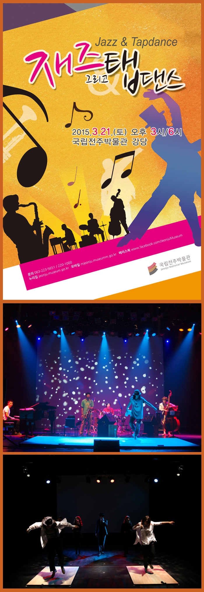 따라서, 오는 3월 21일 토요일 15시와 18시에 국립전주박물관 강당에서 TVN코리아 갓 탤런트 세미파이널에 진출한‘그라운드잼’의 재즈밴드와 탭댄스 퍼포먼스의 앙상블 “재즈 그리고 탭댄스” 공연이 열린다. “재즈 그리고 탭댄스”는 타악기로서의 탭댄스와 재즈라는 음악 장르를 절묘하게 결합시켜 귀로 듣고 눈으로 볼 수 있는 음악 퍼포먼스를 선사하는 무대가 될 것이다. 공연관람은 무료이며, 3월 16일 월요일 오전 10시부터 국립전주박물관 홈페이지를 통해 선착순으로 예약하여 관람할 수 있다.