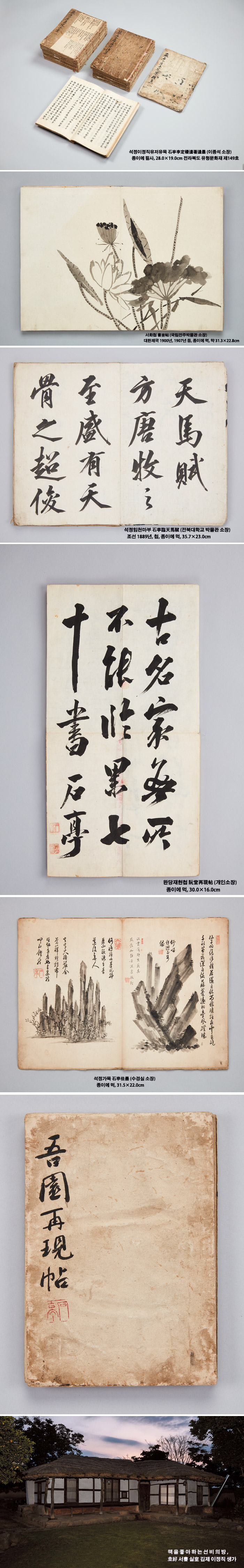 첫 번째는 조선에서 근대로, 전통을 배우고 끊임없이 수련하여 후학들에게 전했던, 법첩 연구의 1인자로서의 이정직을 조명합니다. 추사秋史 김정희 金正喜(1786~1856)를 배워 썼던 <완당재현첩>에서부터 오원吾園 장승업張承業(1843~1897) 그림을 보고 배운 <오원재현첩> 등 유명 서화가의 작품을 통해 배우고 자기만의 세계를 만들어갔습니다. 중국 서예의 맥에 깊은 관심을 가졌고, 단순히 모양을 베껴쓰는 것에 그치지 않고 중국 및 조선 명필가의 글씨를 수없이 임서臨書하면서 골자를 터득하고 자기 것으로 소화하는 데에 노력을 기울였다는 것이 특징입니다.