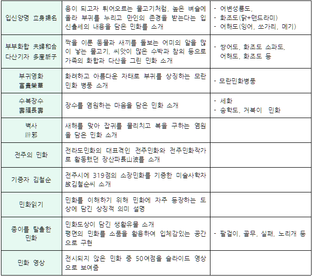 민화는 장수, 다산, 부귀, 액막이, 백년해로 등과 같이 사람들의 소망과 바람을 담은 그림으로, 현재를 살아가는 우리네 삶에서도 민화를 감상하며 기원하는 바는 그대로 남아 있다. 이처럼 민화에 담긴 의미와 매력을 감상할 수 있도록 이번 민화전에서는 입신양명, 부부화합, 다산기자, 부귀영화, 벽사, 수복장수 등의 색션으로 나눠 구성하였다. 어변성룡도, 화조도, 모란도, 작호도, 십장생도 등 다양한 민화를 감상할 수 있을 뿐만 아니라 매화, 국화, 여치, 가지, 앵무, 개, 수탉 등 민화 속 동식물 등의 보편적 상징성과 작가들의 해학적 표현 방법 등도 선보일 예정이다.