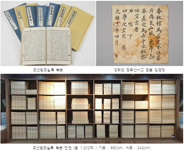 이번 전시에서 실록 복본 전권을 책장에 담아 전시한다. 조선왕조실록의 위대함을 말할 때 결본이 없고 분량의 방대함을 꼽지만,
