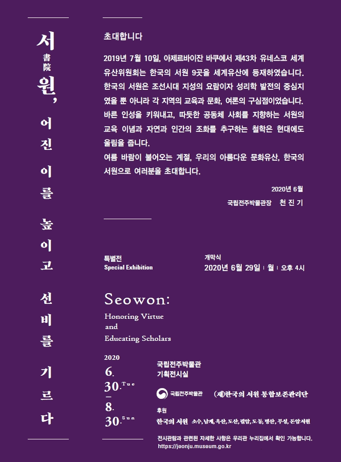 국립전주박물관은 (재)한국의 서원 통합보존관리단과 특별전 <서원, 어진 이를 높이고 선비를 기르다>를 개최합니다.