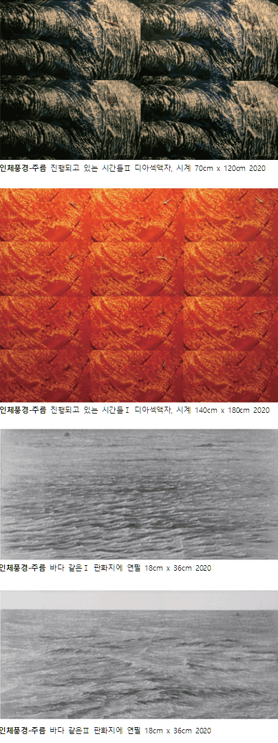 세 번째로 ‘각기 다른 주름들’이라는 작품은 15개의 동일한 이미지에 서로 다른 시간의 시계를 설치한 작품이다.