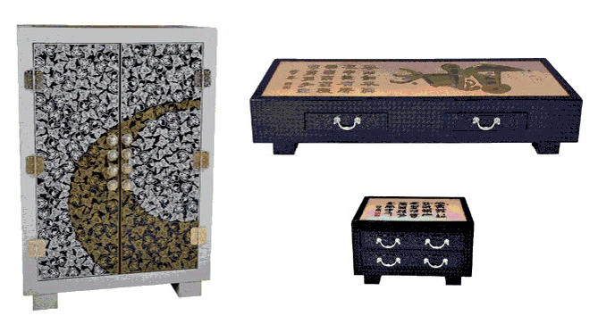 각종 문양과 문자의 새김질, 다양한 소재로 작가의 미의식을 구현한 성숙된 그녀의 작품은 선, 형, 색의 조화가 아름다운 다도상, 장롱,