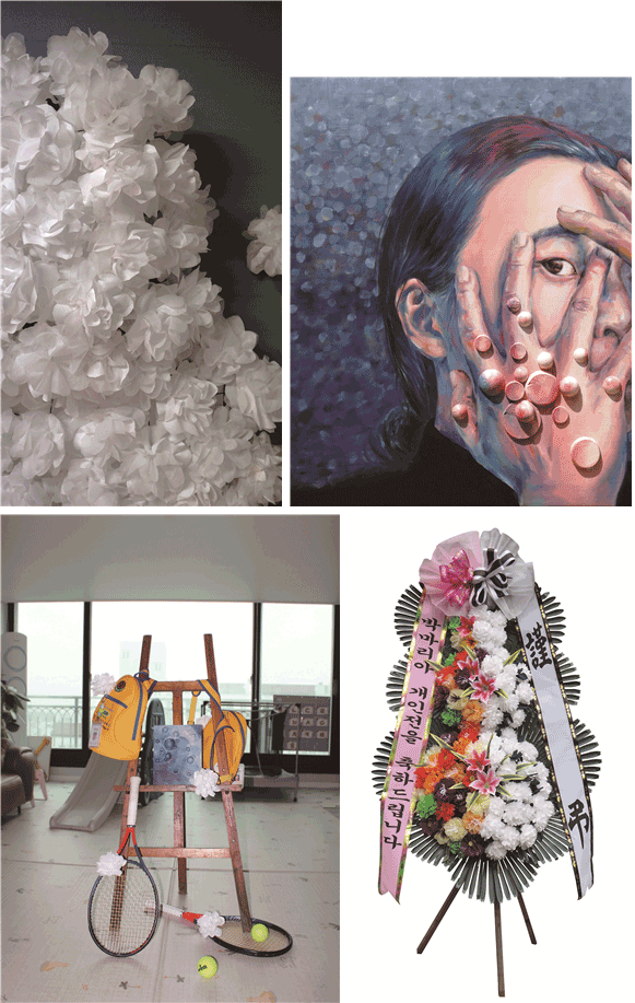 마스크가 새로운 꽃이 되었다. 이름 모를 꽃이 봉긋봉긋 솟아 벽면에 넓게 퍼진다.