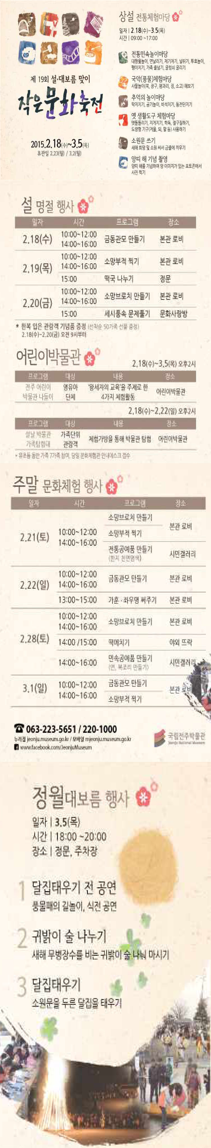 국립전주박물관(관장 유병하)은 을미년(乙未年) 새해를 맞이하여 2월 18일부터 3월5일까지「제19회 설~대보름맞이 작은문화축전」을 개최한다. 올해로 19회를 맞이하는 작은문화축전은 설부터 정월대보름까지 진행하며 행사기간에는 전통민속놀이와 옛 선조들이 사용했던 생활도구나 추억의 놀이를 직접 체험할 수 있다.