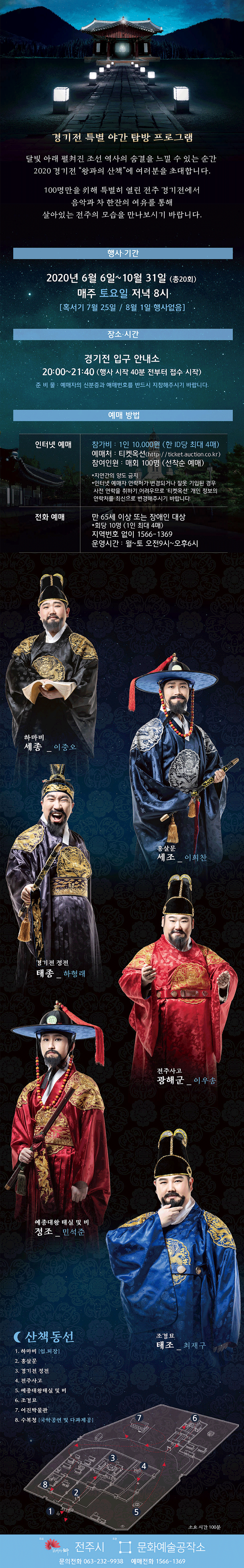 “전주 경기전” 매주 토요일 저녁 비밀의 문이 열린다. 100명에게만 주어진 특별한 시간! 밤의 경기전을 탐하라. 달빛아래 펼쳐진 조선역사의 숨결을 느낄수 있는 순간 2020 경기전 “왕과의 산책”에 여러분을 초대한다. 100명만을 위해 특별히 열린 전주 경기전에서 음악과 차한잔의 여유를 통해 살아있는 전주의 모습을 만나 보시길 바란다. 문화유산 해설과 음악 그리고 차 한잔의 여유를 통해 가장 아름다운 한국, 전주를 만나 보시길 바란다.
