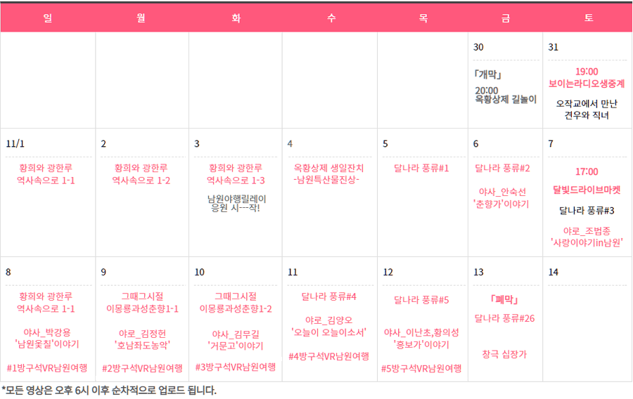 지역문화재 활용사업 일환으로 진행하는 「2020 남원 문화재 야행 – “광한루 600여년! 달나라 궁전으로 초대”」에 많은 참여바랍니다. 진행방법 : ON-tact(온라인대면) 진행 행사내용 : 신관사또 부임행차 길놀이, 창작 국악공연, 달빛소리 보이는 라디오 생중계, 남원문화 골든벨 등 참여방법 : 홈페이지 www.남원문화재야행.kr / 유튜브 남원문화재야행 문의사항 : 유)지리산섬진강문화재활용사업단(☎ 636-1855) 행사일정