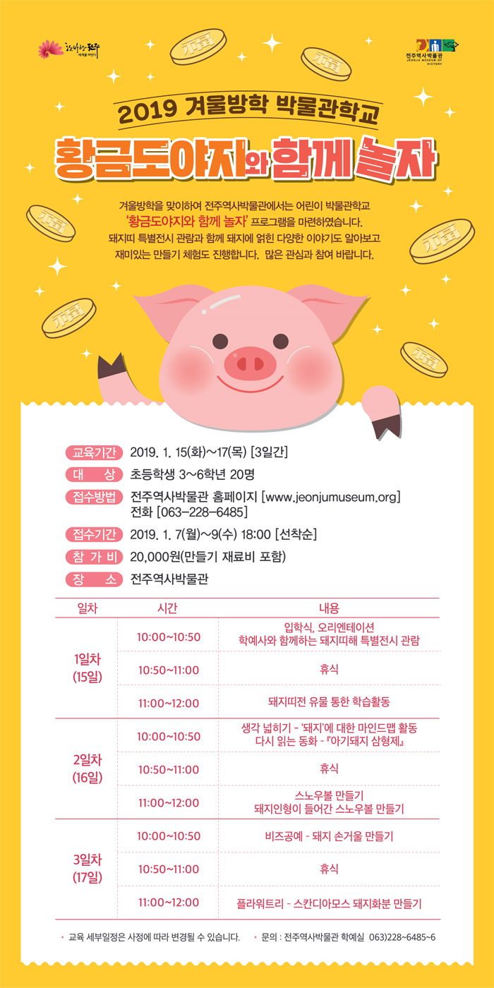 전주역사박물관(관장 이동희)은 겨울방학을 맞아 초등학교 3학년~6학년을 대상으로 1월 15일부터 17일까지 3일간 ‘겨울방학 박물관학교’를 진행한다. ’황금도야지와 함께 놀자‘라는 주제로 열리는 이번 <겨울방학 박물관학교>에서는 올해의 십이지 동물인 ‘돼지’를 소재로 전시관람, 탐구학습, 만들기 체험 등의 다채로운 프로그램이 준비되어있다.