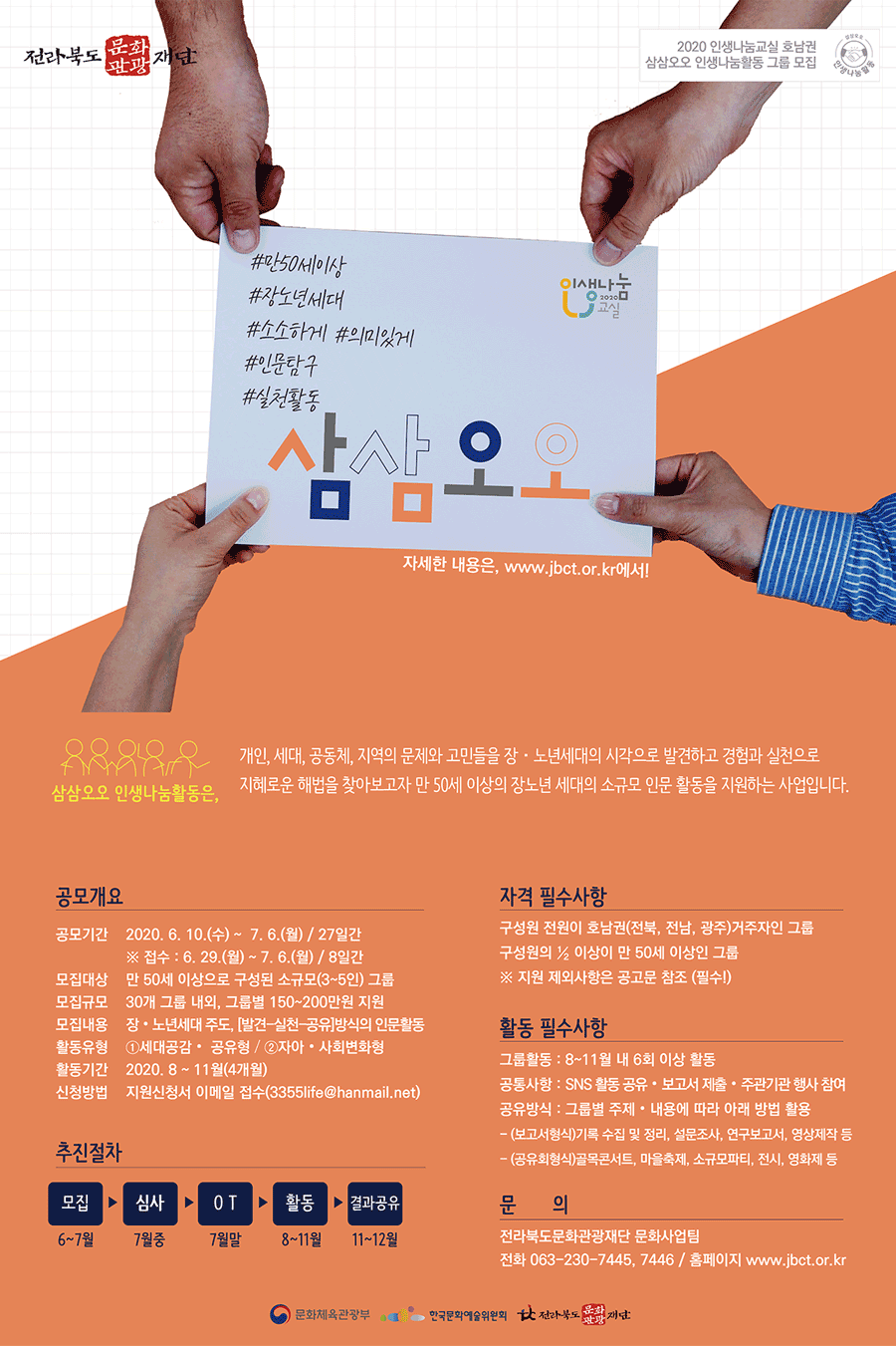 재단과 한국문화예술위원회가 주관하고 문화체육관광부가 주최하는 ‘삼삼오오 인생나눔활동’은 7월 6일까지 공모와 접수를 진행한다.