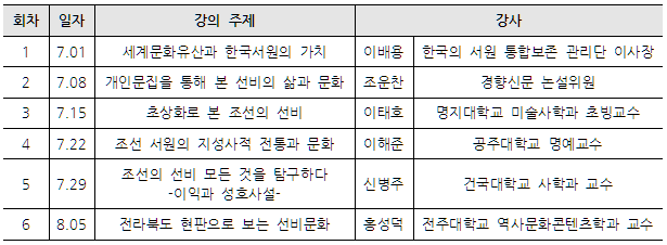‘서원, 어진 이를 높이고 선비를 기르다’(개최: 6월 30일~8월 30일) 연계 강의로 마련하였습니다.