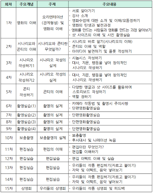 이 교육을 통해 영화 전반에 대한 지식과 촬영 및 편집효과기술을 습득하고 팀을 구성하여 공동으로 연출하고
