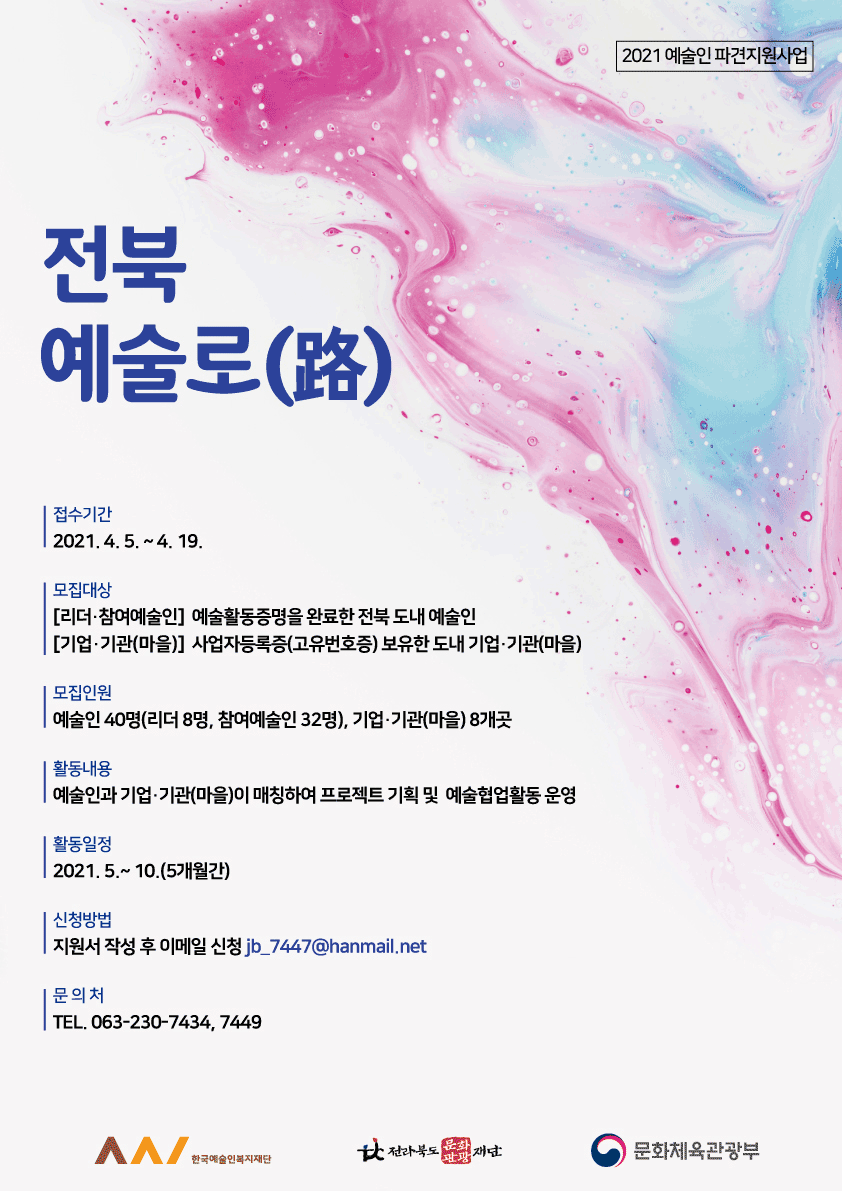 전라북도문화관광재단의 전라북도예술인복지센터는 ‘2021 전북 예술인파견지원사업-예술로(路)’에 참여할