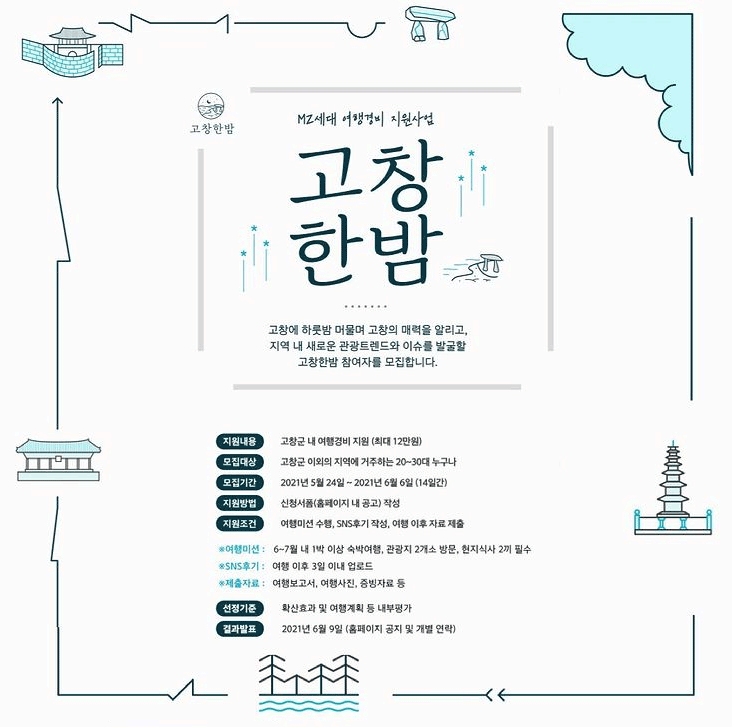 MZ세대를 위한 여행경비 지원사업 '고창한밤' 참여자를 모집합니다! 고창한밤이란? MZ세대 중심의 관광트렌드 및 이슈 공유를 통해 지역 내 다양한 세대층이 유입되도록 유도하고 체류형 관광코스 및 신규관광지를 발굴하고자 하는 사업입니다.
