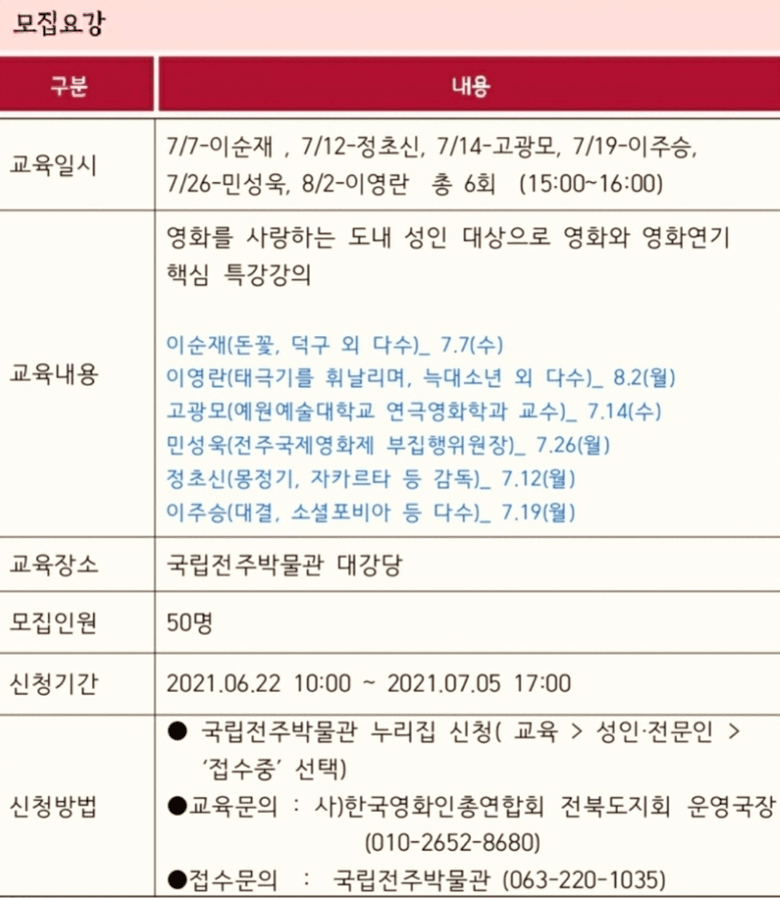 <2021년 영화아카데미> 강좌는 선착순 50명을 모집하며 6월 22일(화)부터 7월 5일(월)까지 국립전주박물관 누리집에서 신청할 수 있다.