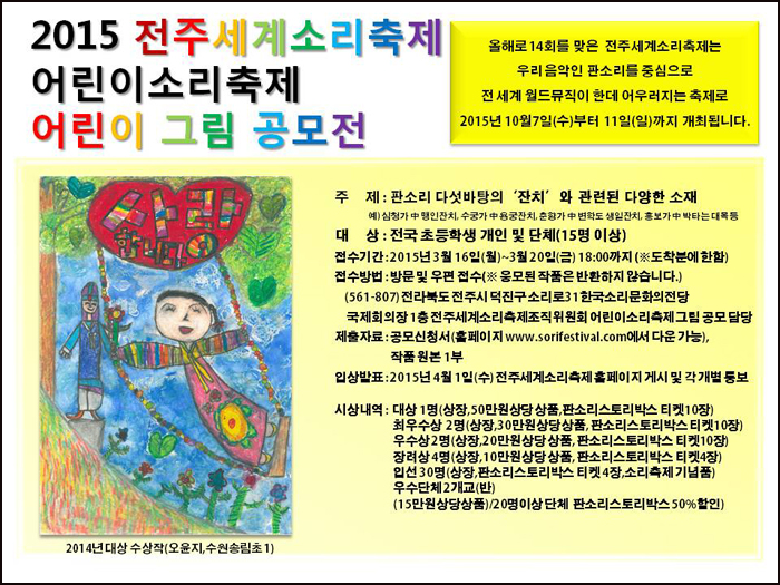 전주세계소리축제조직위(조직위원장 김한)가 ‘어린이 소리축제 그림공모’를 시작한다. 소리축제는 축제 기간 동안 진행되는 ‘어린이 소리축제’를 폭넓게 알리고 어린이들이 판소리를 친근하게 접하게 함으로써 우리 소리에 대한 관심을 높이기 위해 해마다 어린이 그림공모를 진행하고 있다.