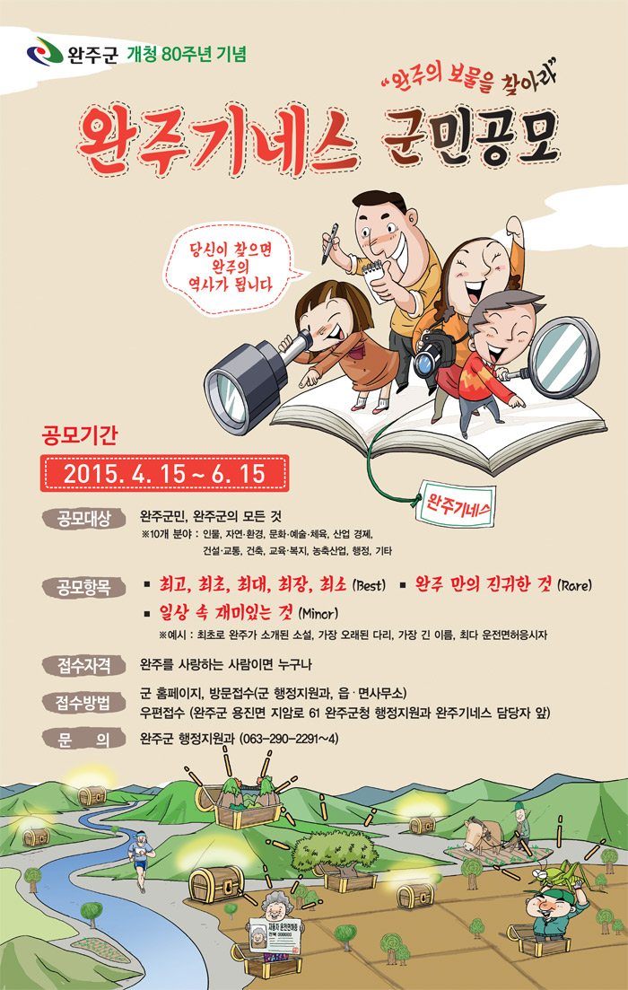완주군은 4월 15일부터 두 달간 숨겨진 보물(명물, 자랑거리, 별난 이색기록 등)을 찾는 ‘완주기네스 군민공모전’을 실시한다고 14일 밝혔다.
