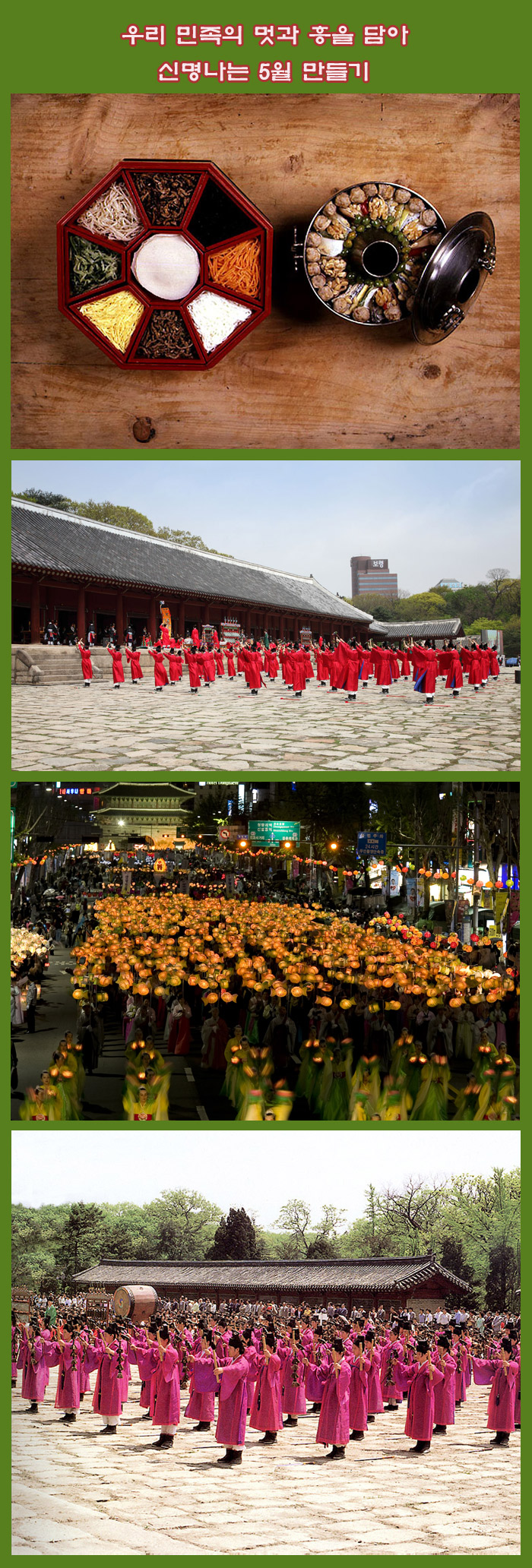 문화재청 국립무형유산원(원장 최맹식)이 후원하고 한국문화재재단(이사장 서도식)이 지원하는 중요무형문화재 5월 공개행사가 전국 곳곳에서 열린다. 우리 전통의 격조와 신명이 어우러진 무형문화재의 멋과 흥을 담아 푸른 5월에 펼쳐질 예정이다.