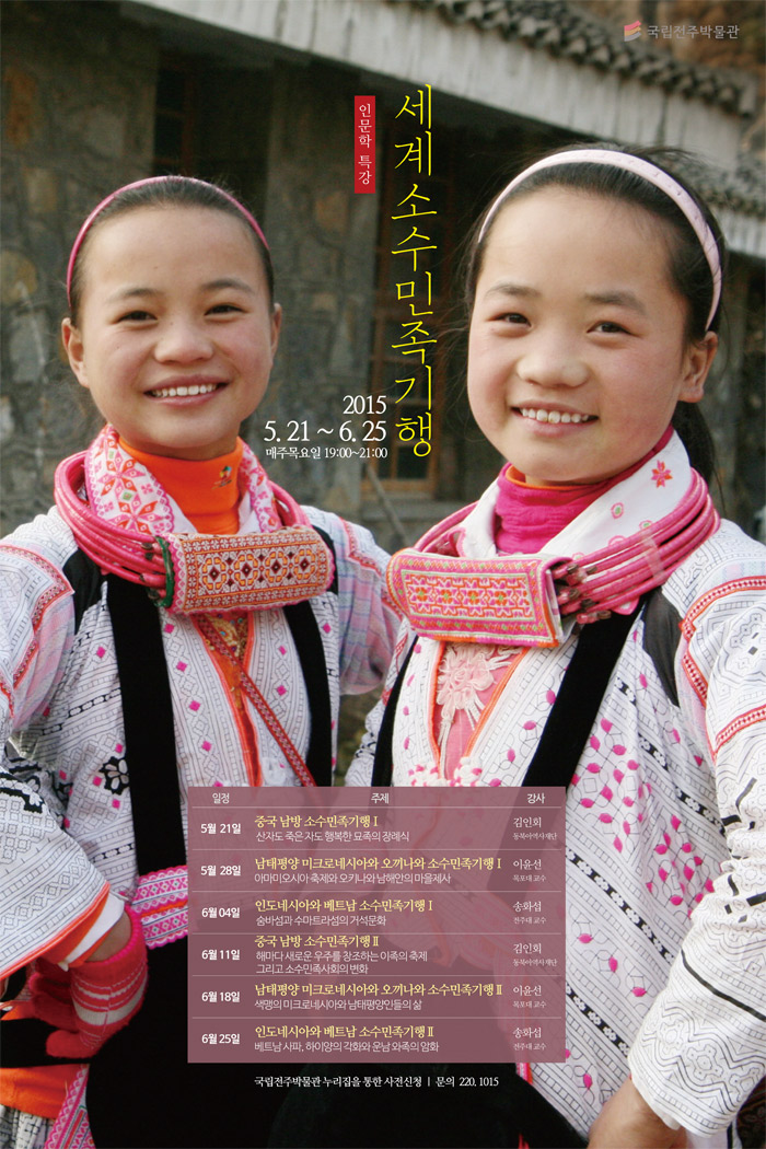 국립전주박물관(관장 유병하)은 오는 21일부터 6월 25일까지 매주 목요일 오후 7시에 인문학 특강 ‘세계소수민족기행’을 6번에 걸쳐 운영한다. 21세기 우리는 급격한 세계화 속에서 살아가고 있다. 이번 인문학 특강은 중국 남방, 남태평양 미크로네시아, 베트남 등 세계 곳곳의 누비는 소수민족 연구자들의 생생한 이야기를 통해 21세기에도 그들만의 고유한 풍습과 문화를 이어나가는 삶을 살펴볼 수 있도록 마련되었다.